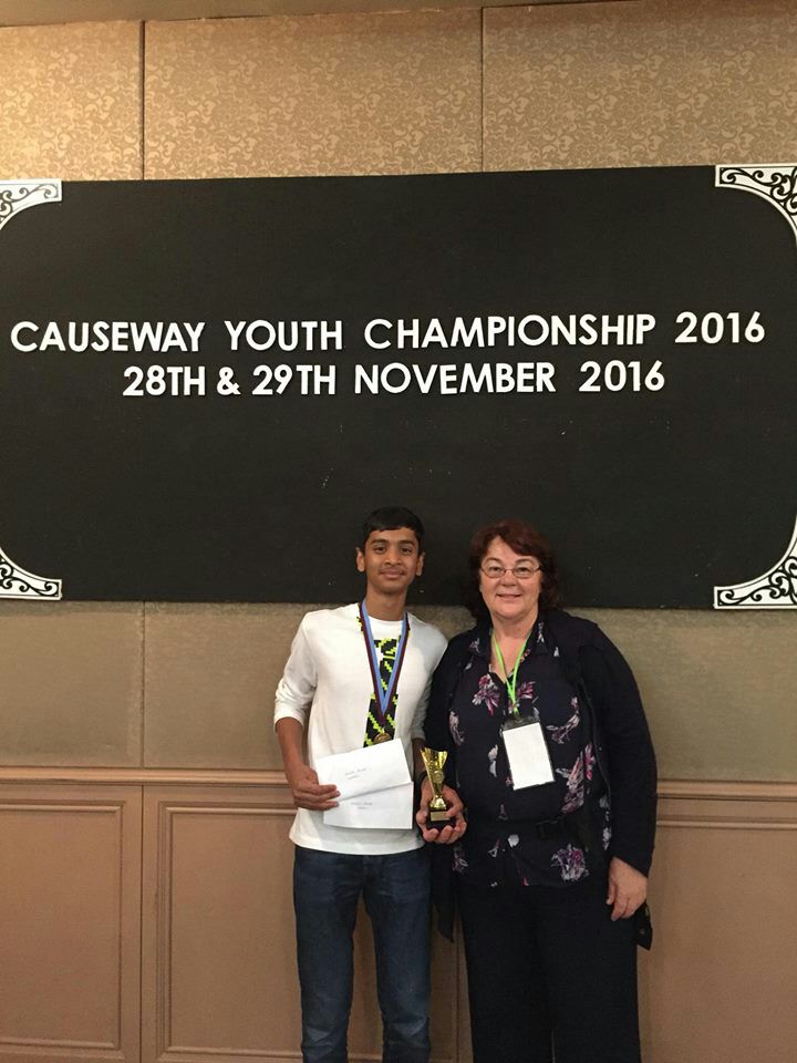 Johor Bahru(Cliff News) Abdullah Abbasi of Pakistan clinches the first title of the Causeway Scrabble Challenge by winning the youth event at Johor Bahru, Malaysia today.The 16 year old was in great form throughout the tournament and remained No. 1 or 2 all the way. After ending the day one on top Abdullah started the second day by winning his first three matches to take a healthy lead but defeats against Leon Tan Zheng and Tim Mason made it very tight making the last match a must-win situation for AbdullahThe young boy kept his nerves and played a masterly game against Tim Mason and won 490-437 to clinch the title. He finished with a 13-3 win record and a spread of 1079.Leon Tan Zheng of Singapore was the runner-up with 12 wins and a spread of 1103 while Poh Ying Ming of Singapore finished 3rd with 11 wins and a spread of 695.Abdullah will now participate in the adults tournament starting from 30th November along with compatriots Waseem Khatri, M. Inayatullah and Maria Soares who arrived in Malaysia just in time to see Abdullah lift the trophy