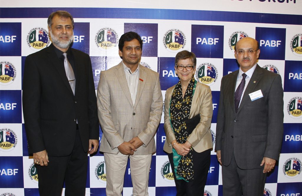 KARACHI: A group photograph of Australian High commissioner H.E. Ms. Margaret Adamson, Parvais Madras wala Chairmain Pakistan-Australia Business Forum, Afzal A. Siddiqui CEO and Muhamamd Ameen Director Skillston during the dinner reception hosted by PABF.