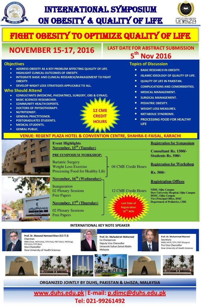 (KarachiCliffNews): Dow University of Health Sciences (DUHS) in collaboration with Universiti Sultan Zainal Abidin, Malaysia is jointly organizing a 3-days “International Symposium on Obesity and Quality of Life” from November 15 – 17, 2016 at DUHS Ojha Campus. The theme of the Symposium is “Fight Obesity to Optimize Quality of Life”. The aim of the Symposium is to Address Obesity as a key problem affecting quality of life, highlight clinical outcomes of Obesity, integrate basic and clinical research/management to fight and to develop weight loos strategy applicable to all. It also aims to bring together Consultants, Basic Science Researchers, Community Health Experts, Physiotherapists, Nutritionists, General Practitioners, Postgraduate Students and General Public under a single platform to discuss Basic Research in Obesity and Islamic Ideology of Quality of Life. The Core Committee member of the Symposium includes Prof. Masood Hameed Khan, Founding Vice Chancellor, DUHS Prof. M. Masroor, Pro-Vice Chancellor, DUHS and Prof. Mahadzirah Mohamad, Deputy Vice Chancellor, Universiti Sultan Zainal Abidin, Malaysia. Experts from Pakistan and abroad will be presenting their research papers in the field of Obesity during the 3-days International Symposium. The event focuses on the multifaceted issues confronted during Obesity and its management. The conference will offer an effective combination of lectures, case studies, live demonstrations and clinical innovations conducted by expert professionals in the field and also ignite discussions and debates on practical issues of daily practice.International Symposium on Obesity & Quality of Life.jpg