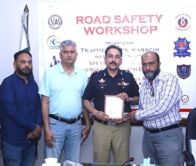 Karachi(Staff Reporter)DIG Traffic and Chairman Sports Board Sindh Police, Syed Peer Muhammad Shah, stated that the e-challan system has significantly reduced accidents and increased awareness among citizens about traffic laws. He made these remarks during a “Road Safety” workshop organized for members of the Sports Journalists Association of Sindh (SJAS).Shah emphasized that e-challans are only issued on roads with proper infrastructure, not on dilapidated roads. He urged SJAS members to spread awareness about road safety and traffic reforms.The Sindh government has implemented e-challan fines in the form of a law after approval from the provincial assembly. Shah encouraged critics to approach the Sindh Assembly for relief.Two apps are being introduced to enhance traffic management, including one for reporting traffic violations. The traffic police will distribute 15% of e-challan income among officials, while 70% will be used at the Sindh government’s discretion.The workshop was attended by Pakistan Sports Writers Federation Secretary General Asghar Azeem, SJAS President Mahmood Riaz, and Secretary Shahid Usman Satti, among others.