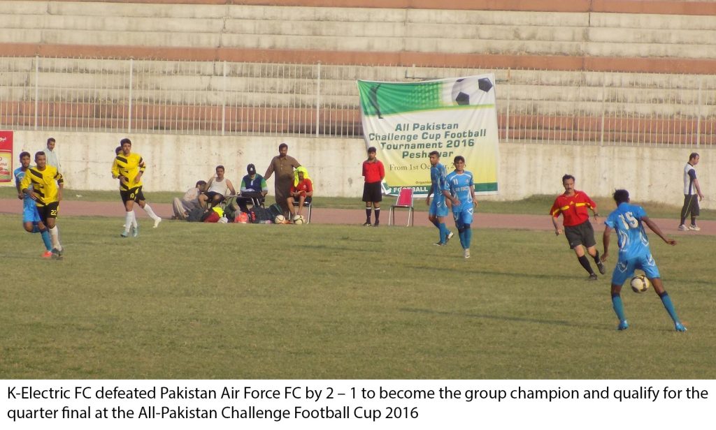 K-Electric FC defeated Pakistan Air Force FC by 2 – 1 to become the group champion and qualify for the quarter final at the All-Pakistan Challenge Football Cup 2016