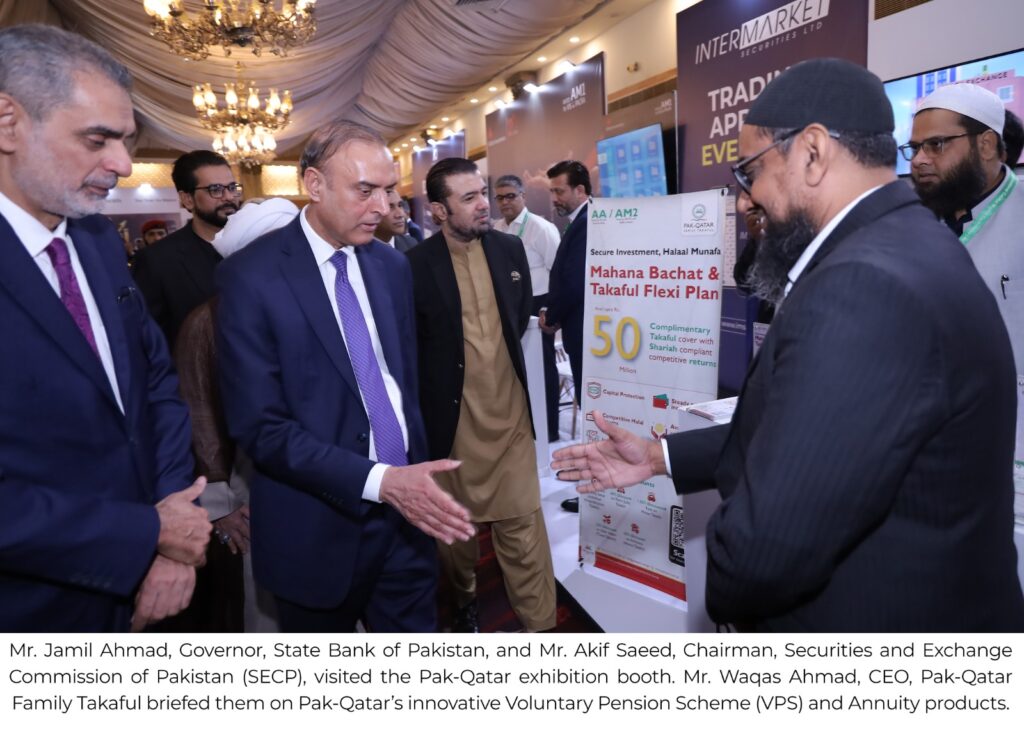Karachi(Cliff News)Pak-Qatar Group participated in the International Capital Market Conference & Expo 2025, held to highlight Pakistan’s progress and potential in fostering sustainable financial growth, investment opportunities, and market innovation. The event brought together leading policymakers, financial institutions, and industry experts to discuss the future of the capital market and the role of Islamic finance in promoting financial inclusion.During the event, Mr. Jamil Ahmad, Governor, State Bank of Pakistan, and Mr. Akif Saeed, Chairman, Securities and Exchange Commission of Pakistan (SECP), visited the Pak-Qatar exhibition booth. They appreciated Pak-Qatar’s role in introducing need-based Takaful, VPS, Annuity and other investment solutions that align with Pakistan’s broader financial literacy and inclusion objectives.