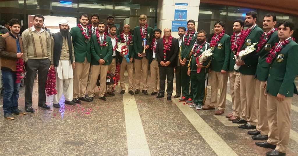 Lahore (Cliff News)The PNF has informed that the Pakistan Netball team after winning the Silver Medal in 1st Asian Men’s Netball Championship 2016 at Kuala Lumpur, Malaysia return back at home at Allama Iqbal International Airport Lahore on today early morning. The office bearers of Punjab Netball Association and Pakistan Netball Federation welcome and congratulate to Pakistan Men’s Netball team for their excellent performance in International Arena. On this occasion, Mudassar Arain, President, Pakistan Netball Federation said that the Pakistan Netball Federation would like a big thank you to Dr. M. Akhltar Nawaz Ganjera, Director General, Pakistan Sports Board for providing the wonderful facilities for training camp and other things for the preparation for International Competition. Further more disclosed that we will get the more success in future inshallah.