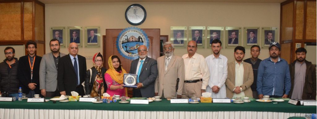 President Karachi Chamber of Commerce & Industry (KCCI) Shamim Ahmed Firpo Presenting Crest to Ms. Amintah Mahreen Jorge from Balochistan University of Information Technology, Engineering & Management Sciences (BUITEMS), who led a BUITEMS delegation to KCCI.Senior Vice President KCCI Asif Nisar, Vice President KCCI Muhammad Younus Soomro, Members of Managing Committee KCCI Atif Jamil ur Rehman, Abdul Rehman Naqi, Muhammad Haris Agar andSecretary General S.M.H. Rizvi are also present at the picture.