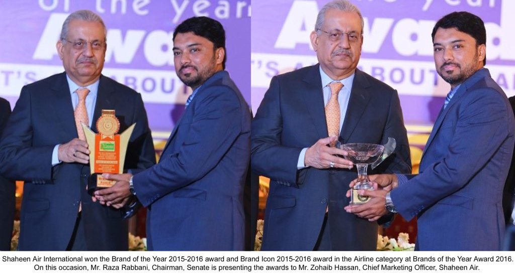 Karachi(Cliff News)Shaheen Air International (SAI)has been conferredwith two top honors at the seventh edition of Brands of the Year Award2016. The airliner has been awardedBrand of the Year Award for 2015-2016 in the Airline Category, while it has clinched Brand Icon Award for2015-2016 in the same category. The awardceremony was organized by BrandsFoundation where the Honorable SenateChairman Mr. Raza Rabbanipresented the awards to Shaheen Air’s Chief Marketing Officer, Mr. Zohaib Hassan.While expressing his jubilant views at this remarkable triumph, Zohaib Hassanstated: “Allah has been really kind upon us and has blessed us with these accolades. This victory reflects the hard work of every individual who isintricately spun into the fabric of Shaheen Air. With this, we are poised to redefine the traveling experience for our valued passengers and set a new standard of air travel in the country.”Initiated in 2007,Brands of the Year Awards recognizebrands that are champions in their specific industries. Each year, the brands are evaluated on the basis of expert panel recommendations, qualitative and quantitative studies after which they are presented with different awards.
