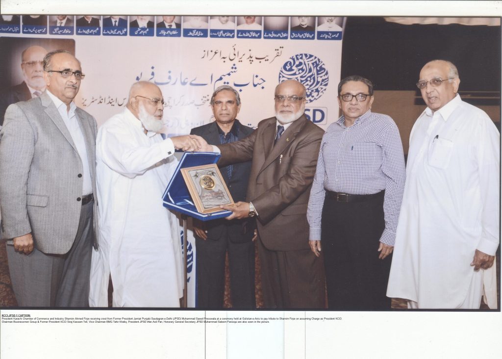 kcci_jpsd1captionPresident Karachi Chamber of Commerce and Industry Shamim Ahmed Firpo receiving crest from Former President Jamiat Punjabi Saudagran-e-Delhi (JPSD) Muhammad Saeed Presswala at a ceremony held at Gulistan-e-Anis to pay tribute to Shamim Firpo on assuming Charge as President KCCI.Chairman Businessmen Group & Former President KCCI Siraj Kassam Teli, Vice Chairman BMG Tahir Khaliq, President JPSD Irfan Asli Pari, Honorary General Secretary JPSD Muhammad Saleem Farooqui are also seen in the picture.