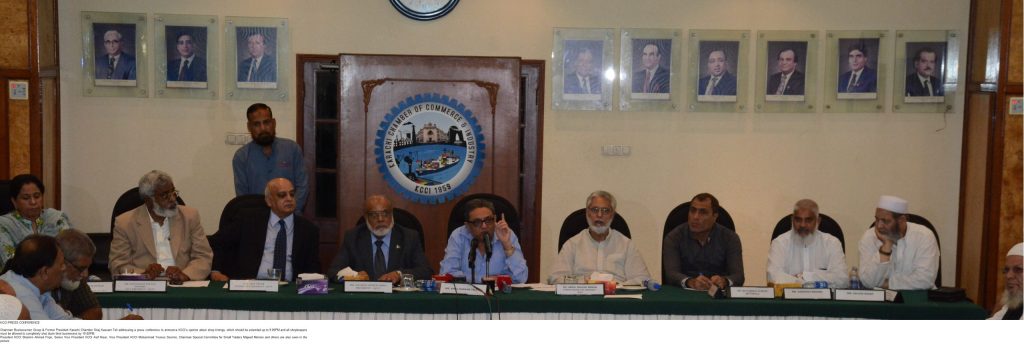 Chairman Businessmen Group & Former President Karachi Chamber Siraj Kassam Teli addressing a press conference to announce KCCI’s opinion about shop timings, which should be extended up to 9:00PM and all shopkeepers must be allowed to completely shut down their businesses by 10:00PM.President KCCI Shamim Ahmed Firpo, Senior Vice President KCCI Asif Nisar, Vice President KCCI Muhammad Younus Soomro, Chairman Special Committee for Small Traders Majeed Memon and others are also seen in the picture.