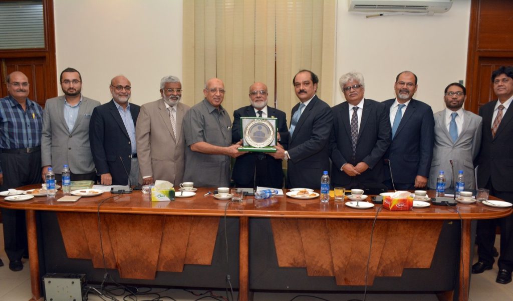 Vice Chairman Businessmen Group (BMG) and Former President Karachi Chamber Tahir Khaliq and President KCCI Shamim Ahmed Firpo presenting KCCI’s crest to President Karachi Tax Bar Association Syed Rehan Hasan Jafri, who led a delegation during its visit to KCCI.Vice President KCCI Muhammad Younus Soomro, former President A.Q. Khalil and others are also present at the picture
